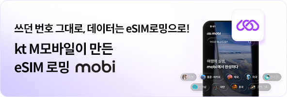 kt M mobile은 통신사가 직접 제공하는 eSIM 데이터 로밍 서비스 mobi를 통해 고객이 해외에서도 쉽고 안정적으로 모바일 데이터를 이용할 수 있는 환경을 제공합니다.